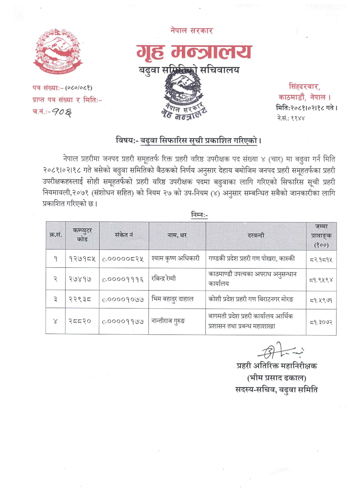 बढुवाका लागि सिफारिस हुनेमा एक नम्बरमा श्याम कृष्ण अधिकारी रहेका छन् । त्यस्तै बढुवा सिफारिसमा रविन्द्र रेग्मी, भीम बहादुर दाहाल र नानीराम गुरुङ रहेका छन् ।