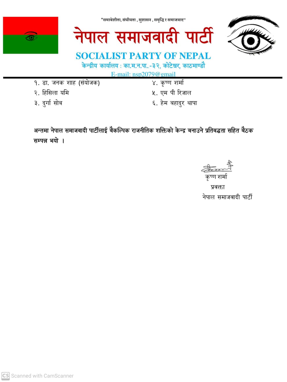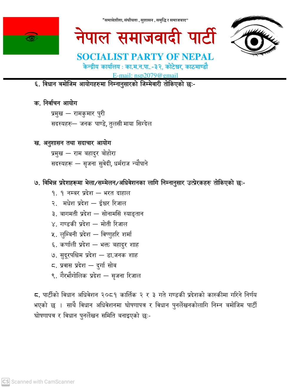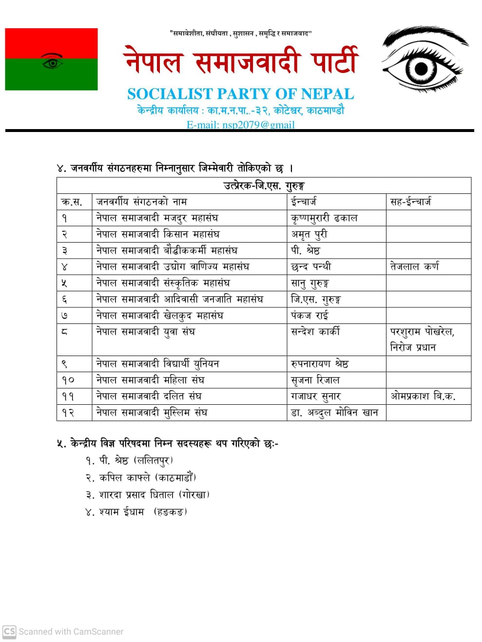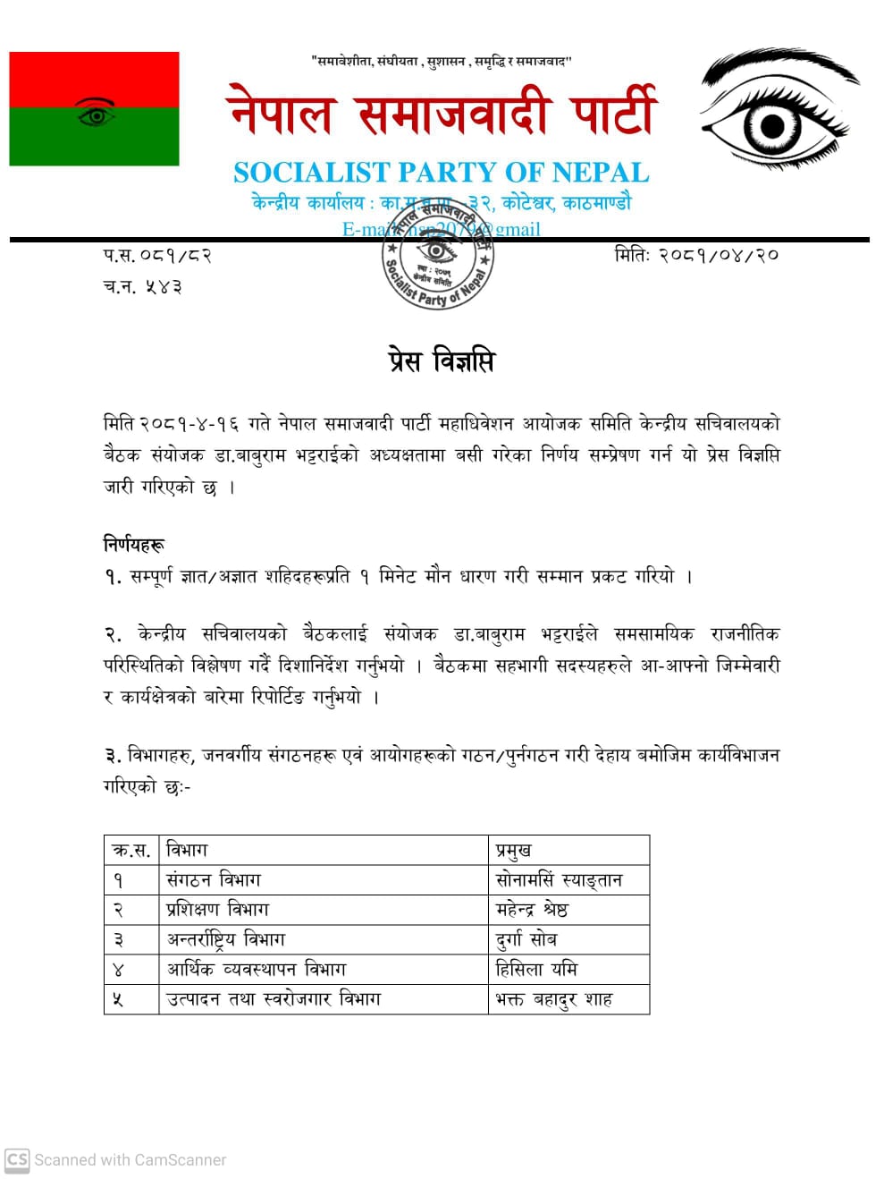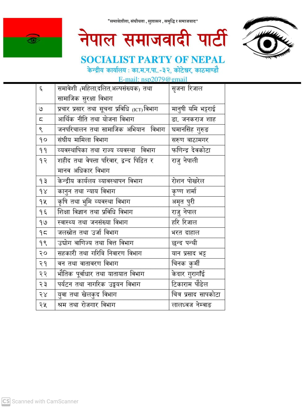 साथै प्रचारप्रसार तथा सूचना प्रविधि विभाग प्रमुख मानुषी यमी भट्टराई, केन्द्रीय कार्यालय व्यवस्थापन विभाथ प्रमुखमा रोशन पोखरेल र व्यवस्थापिका तथा राज्य व्यवस्था विभाग प्रमुखको जिम्मेवारी फणिन्द्र देवकोटालाई दिइएको नेसपाले जनाएको छ ।