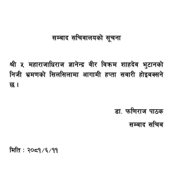 काठमाडौँ । पूर्व राजा ज्ञानेन्द्र शाहले भुटान भ्रमण गर्ने भएका छन् । शाह आगामी साता निजी भ्रमणको सिलसिलामा भुटान प्रस्थान गर्ने संवाद सचिव डा. फणीराज पाठकले जानकारी दिए ।