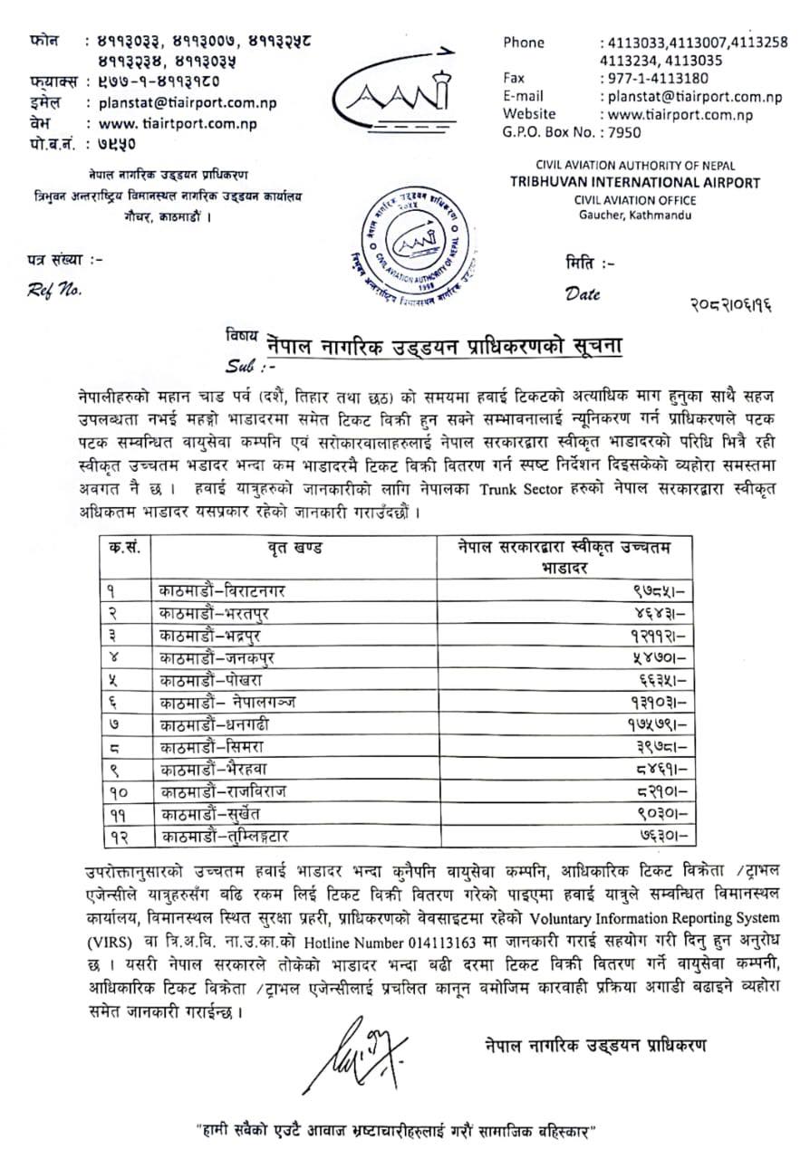 काठमाडौं । नेपाल नागरिक उड्डयन प्राधिकरणले आन्तरिक हवाई भाडादर सार्वजनिक गरेको छ । प्राधिकरणले बिहीबार भाडादर सार्वजनिक गरेको हो । प्राधिकरणका अनुसार, काठमाडौं–विराटनगर भाडा ९ हजार ७८५ तय भएको छ । यस्तै, काठमाडौं–भरतपुरको चार हजार ६४३, काठमाडौं–भद्रपुर १२ हजार ११२, जनकपुरको पाँच हजार ४७०, पोखराको ६ हजार ६३५ र नेपालगन्जको १३ हजार १०३ रुपैयाँ तय भएको छ ।