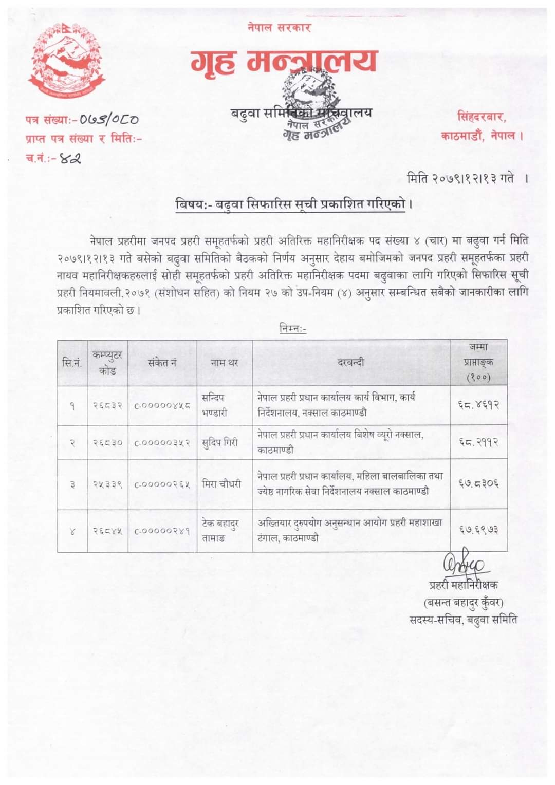 बढुवा सिफारिस हुनेमा डीआईजी सन्दीप भण्डारी, सुदिप गिरी, मिरा चौधरी र टेकबहादुर तामाङ छन् । उनीहरू शुक्रबार आईजीपी बढुवा भएका बसन्तबहादुर कुँवरकै ब्याची हुन् । उनीहरूलाई गृहसचिवको अध्यक्षतामा बसेको बढुवा समितिको बैठकले एआईजीमा बढुवा सिफारिस गरेको हो ।