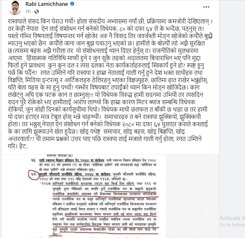 ‘समाचारहरू त बने रास्वपा झुक्कियो । झुक्कियौँ होला । तर भन्नुस्– नेपाल ऐन संशोधन गर्न बनेको विधेयक २०८० मा दफा ६४ घुसाएर कसले कसलाई केका लागि झुक्याउने खेल हुँदै छ ? खोइ यथेष्ट समाचार, खोइ बहस, खोइ विज्ञप्ति, खोइ अन्तरवार्ता ?? ।’