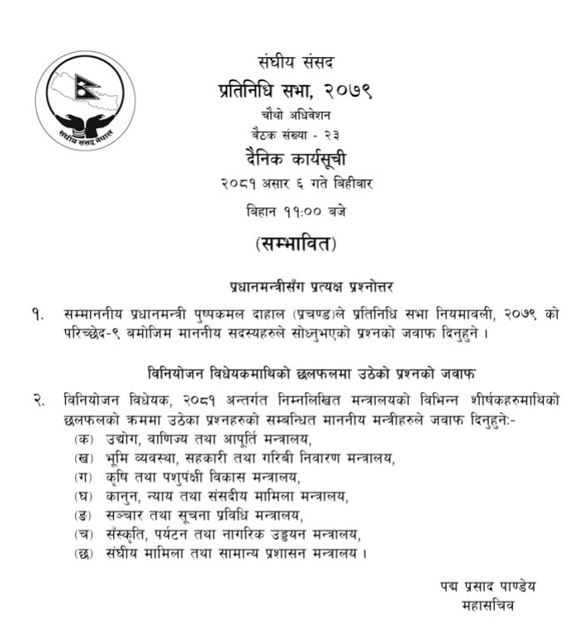 प्रधानमन्त्री पुष्पकमल दाहाल प्रचण्डले प्रतिनिधिसभा नियमावली, २०७९ अनुसार सांसदहरूले सोधेका प्रश्नको जवाफ दिने कार्यसूची रहेको सचिवालयले जानकारी दिएको छ ।