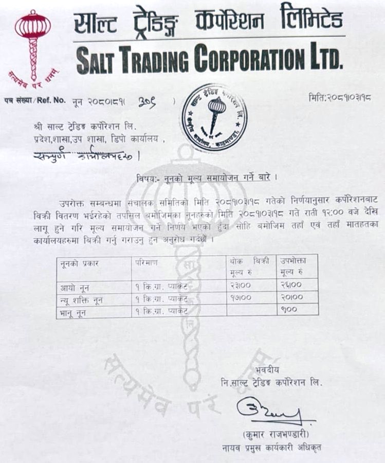 काठमाडौं । साल्ट ट्रेडिङ कर्पोरेसन लिमिटेडले खाने नुनको मूल्य बढाएको छ। साल्ट ट्रेडिङ सञ्चालक समितिको आज (मंगलबार) को निर्णयअनुसार नुनको मूल्यवृद्धि गरिएको नायब प्रमुख कार्यकारी अधिकृत कुमार राजभण्डारीले जारी गरेको सूचनामा उल्लेख छ।